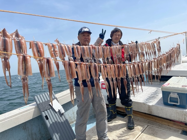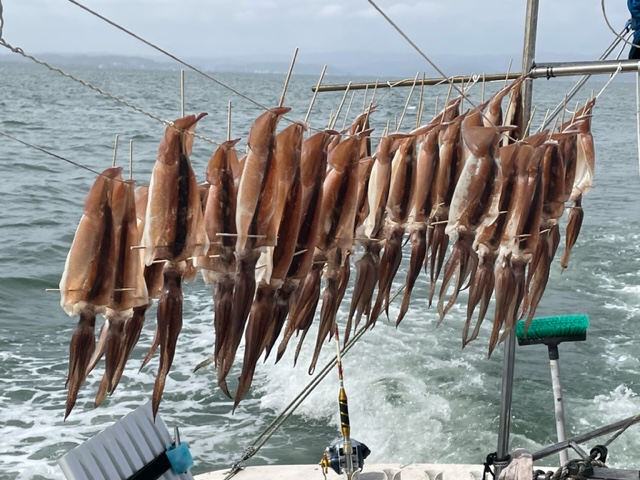スルメイカ釣り釣果ブログ / 2023年3月27日 2023年3月27日 投入していただく度に2ー7杯ぶらぶらと釣っていかれ 天気も良く天日干しが美味しそうに仕上がりました 。 本日はありがとうございました。