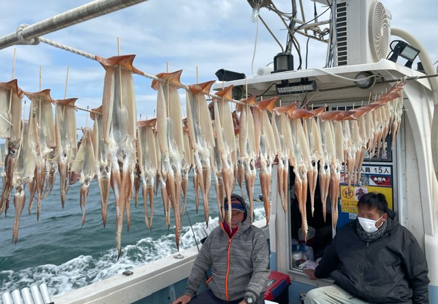 スルメイカ釣果ブログ / 2022年4月3日 2022年4月3日 今日も反応バッチリ! 皆様クーラーパンパン(^^)♪ 天気も良く天日干しが美味しそうに仕上がりました。 本日はありがとうございました。。。