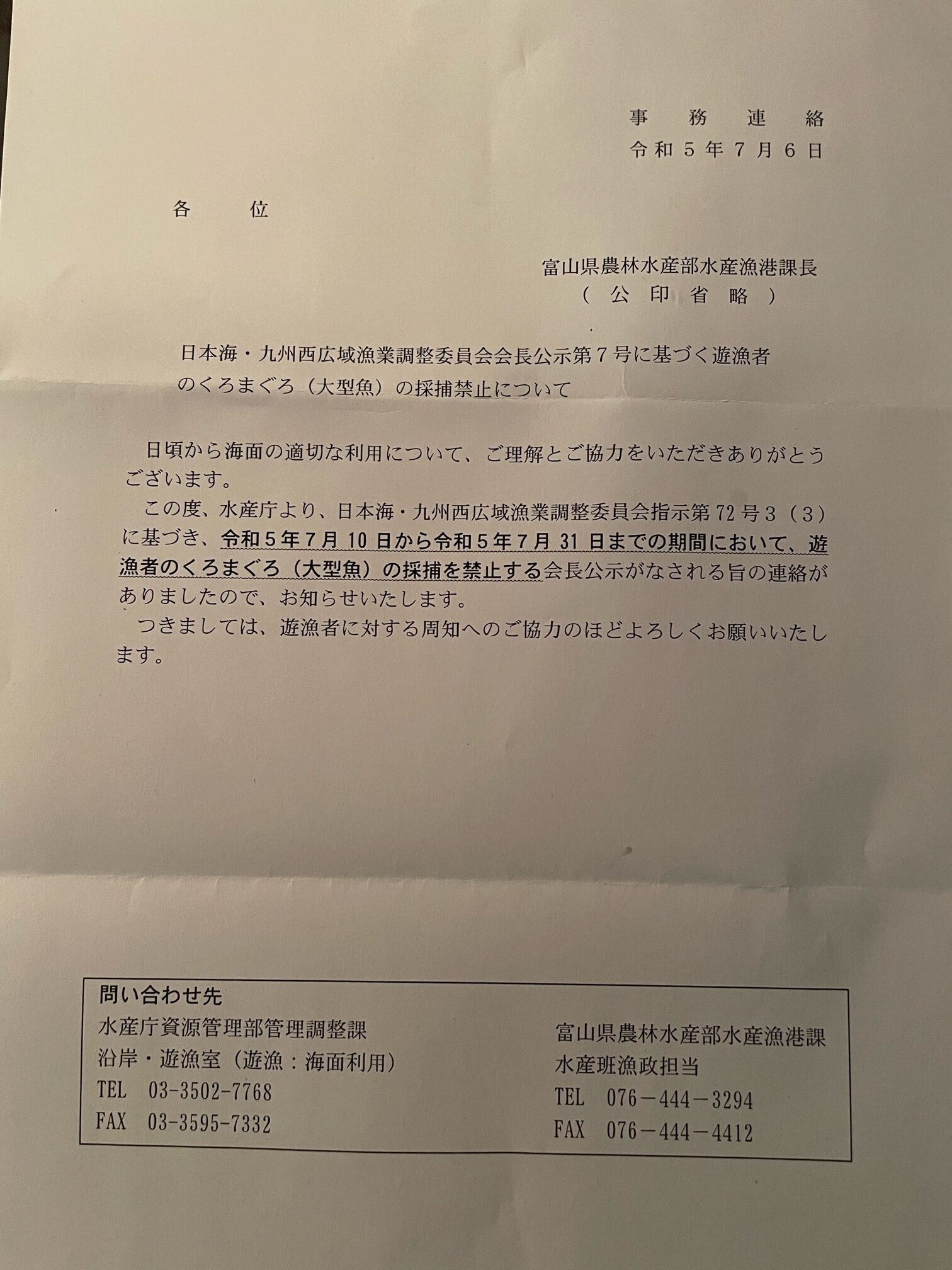 BIGTUNA釣果ブログ / 2023年7月8日 2023年7月8日 7月10日から31日までは 遊漁禁止になりましたのでお知らせいたします。 7月10日以後もご予約頂いておりましたが ご理解くださいませ。 なお 来月8月1日からツナキャスティング釣りにて出航いたしますので ご予約お待ちしております。